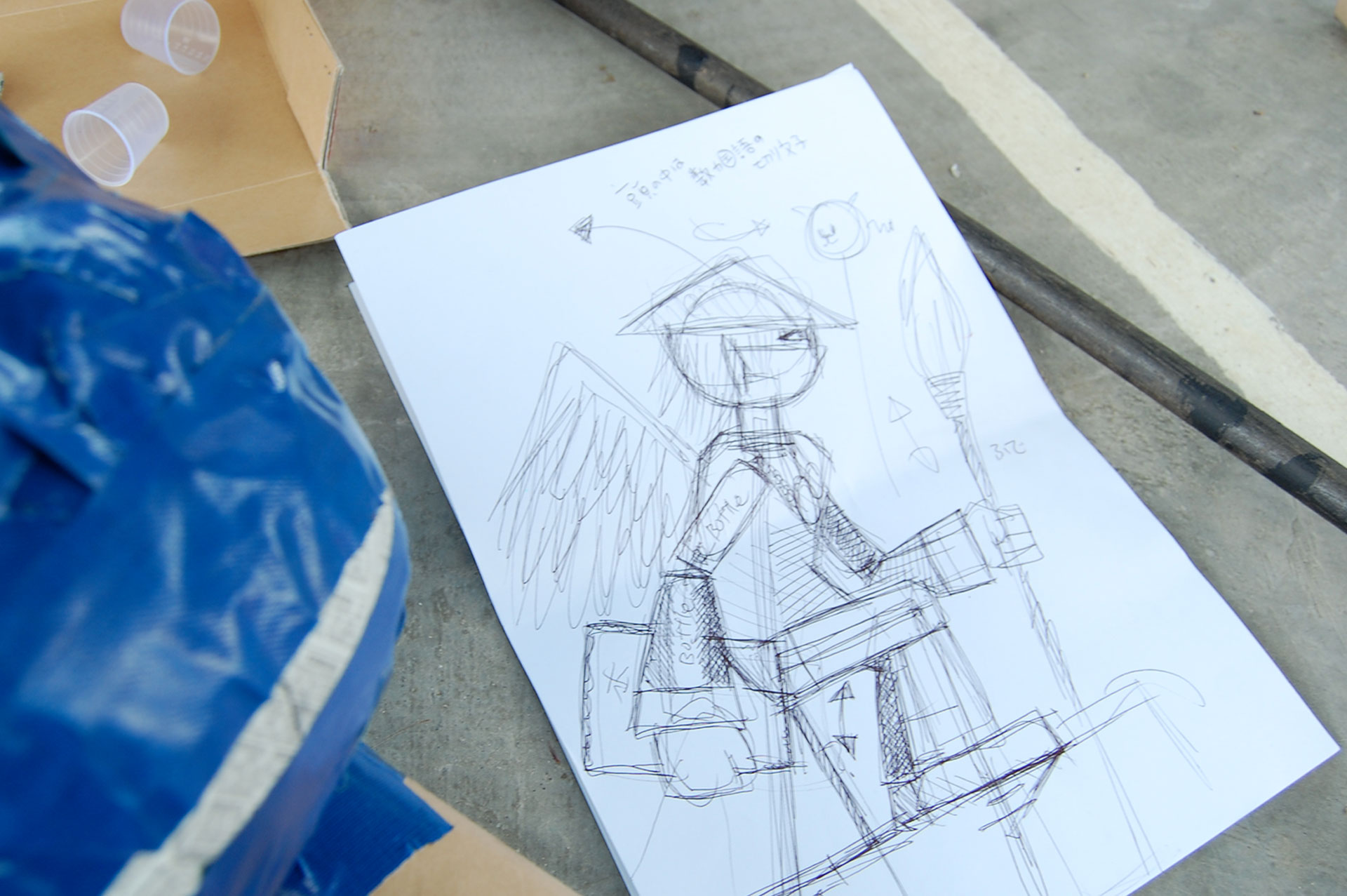 しょうがないから、割と複雑な立ち姿をしているキャラを作る班の「カクダイ」をマジックで描いてあげた。「たとえば、だよ?たとえば。こうでこうじゃん?」みたいに。