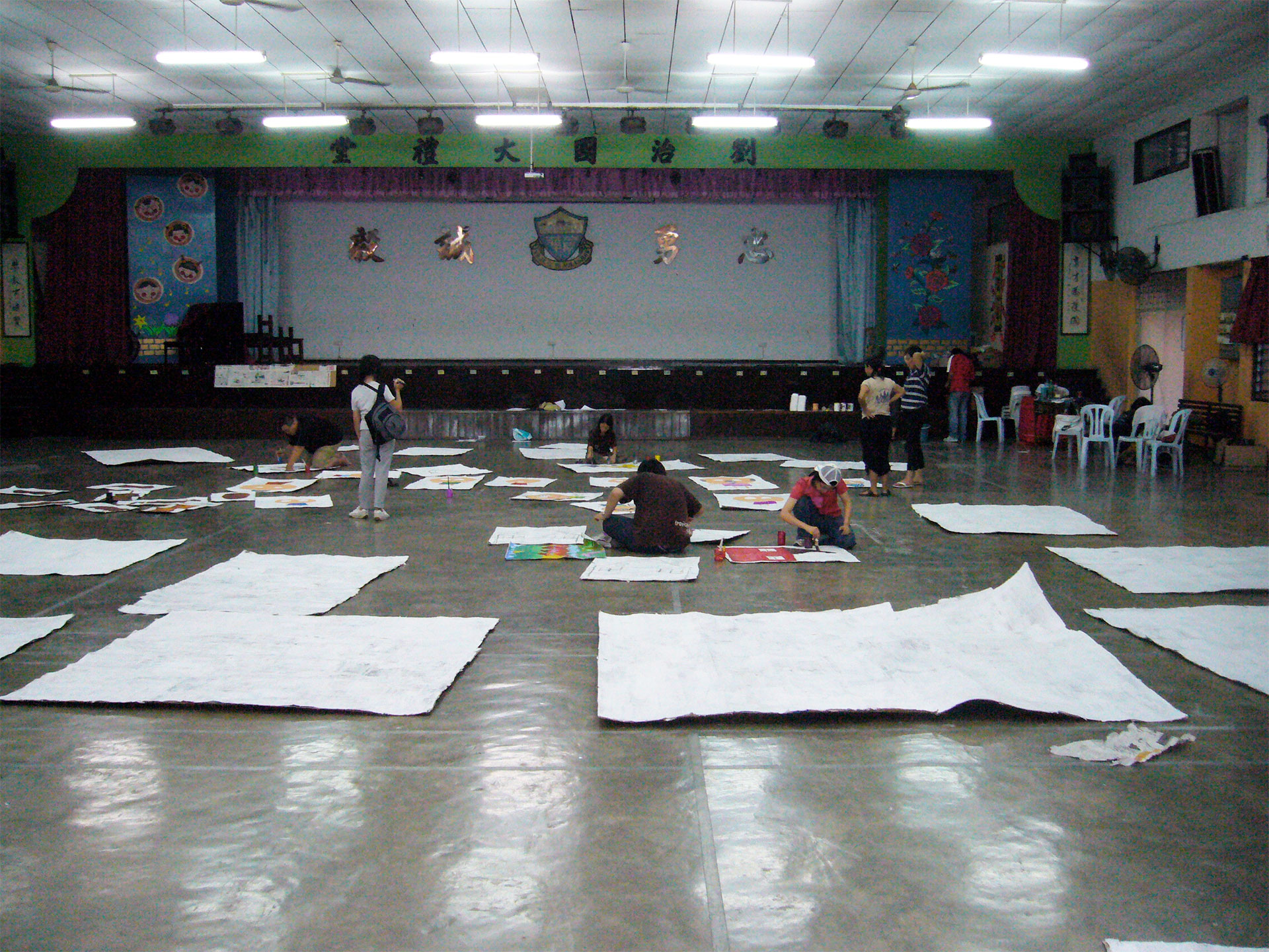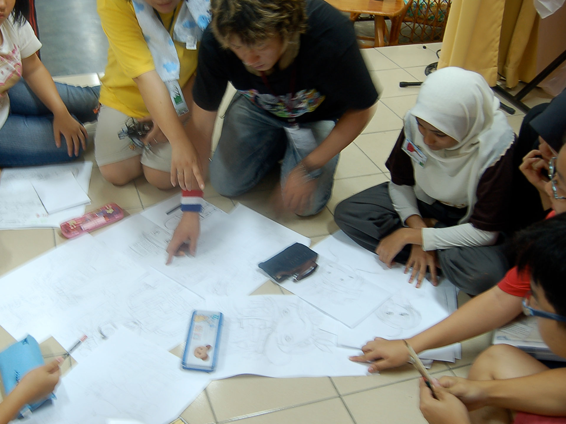 「お絵描き」までで完成形の幼児・幼稚園児班を視察。着々と進んでいるようだが、よくみたら居残りで描いてるの大学生のスタッフばっかじゃん