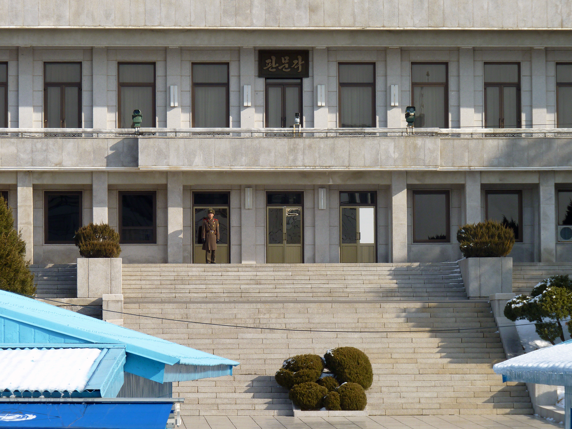 「自由の家」より断然渋い「板門閣」の入口に立つ北側の若い歩哨。